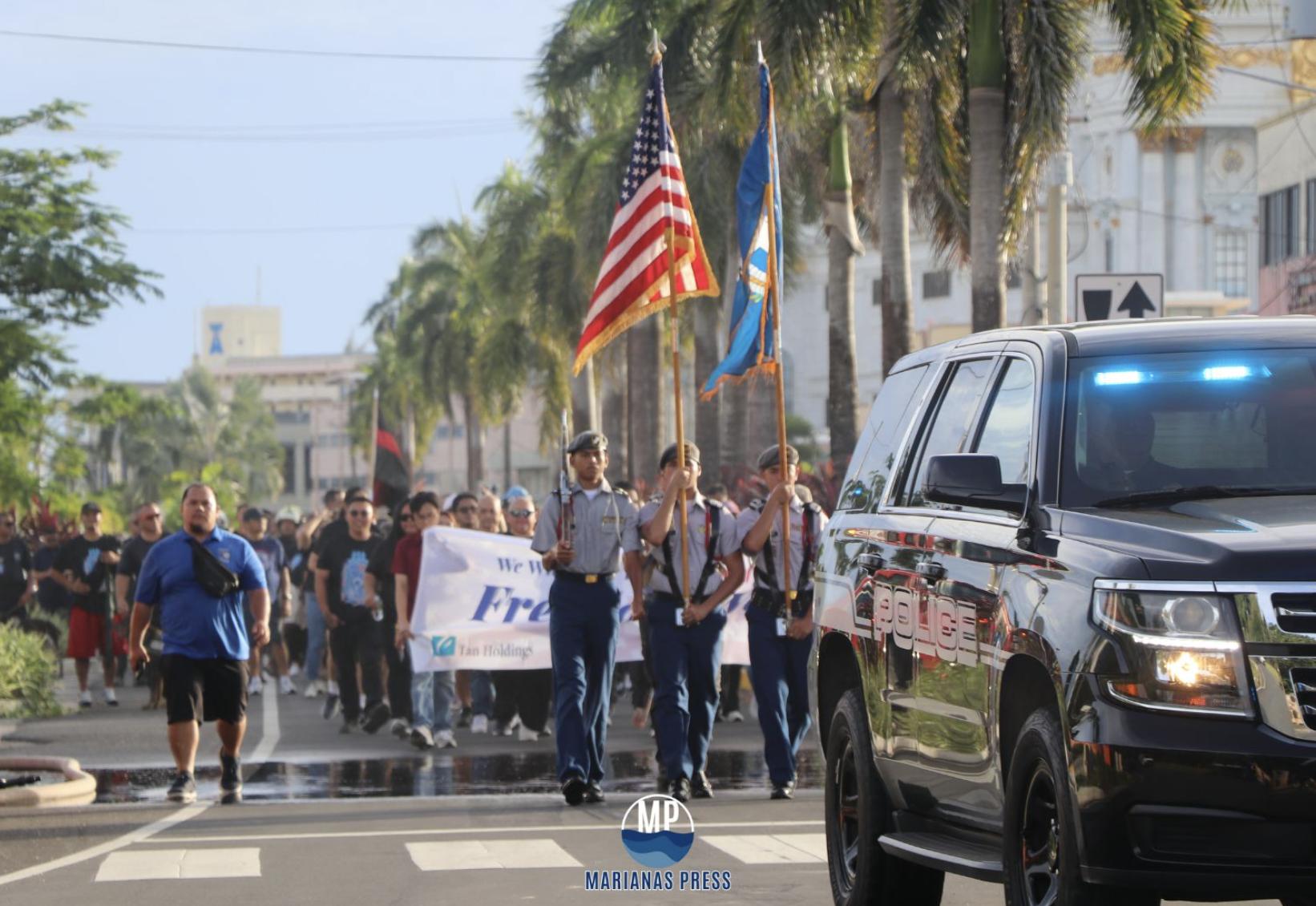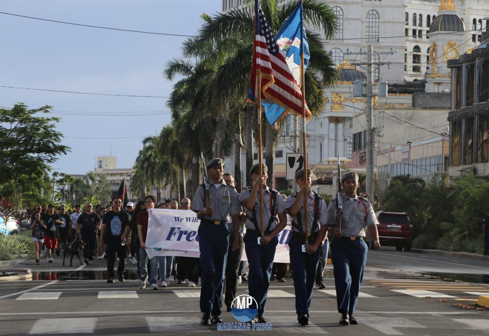 CNMI Governor David Apatang and several dignitaries, followed by a JROTC color guard, led the front of the march, which began at the Carolinian Utt and ended at the American Memorial Park’s Court of Honor, where the We Will Not Forget: Field of Heroes ceremony was held.