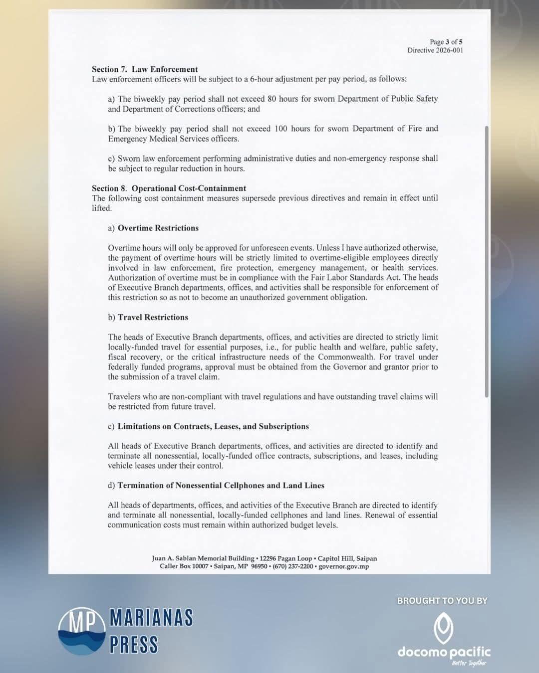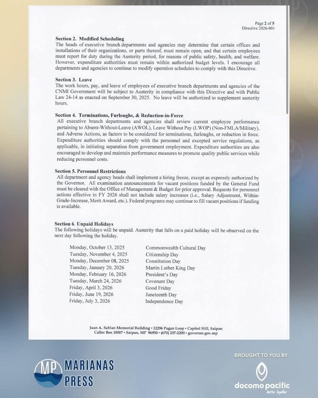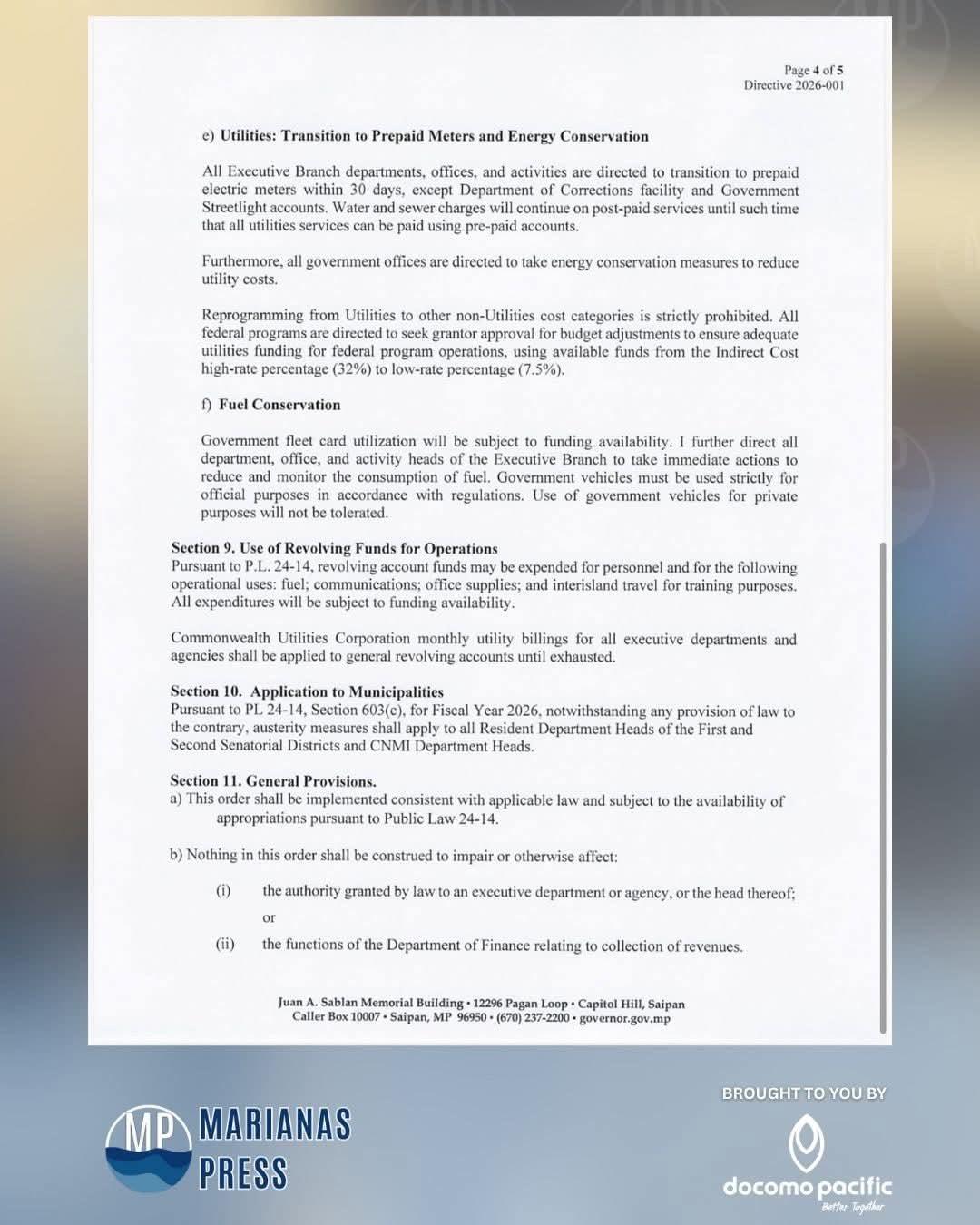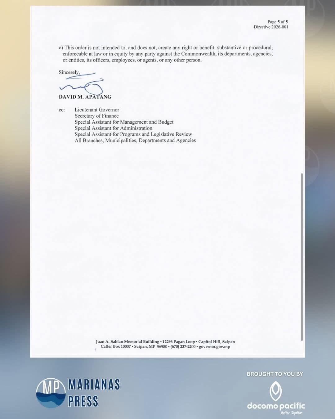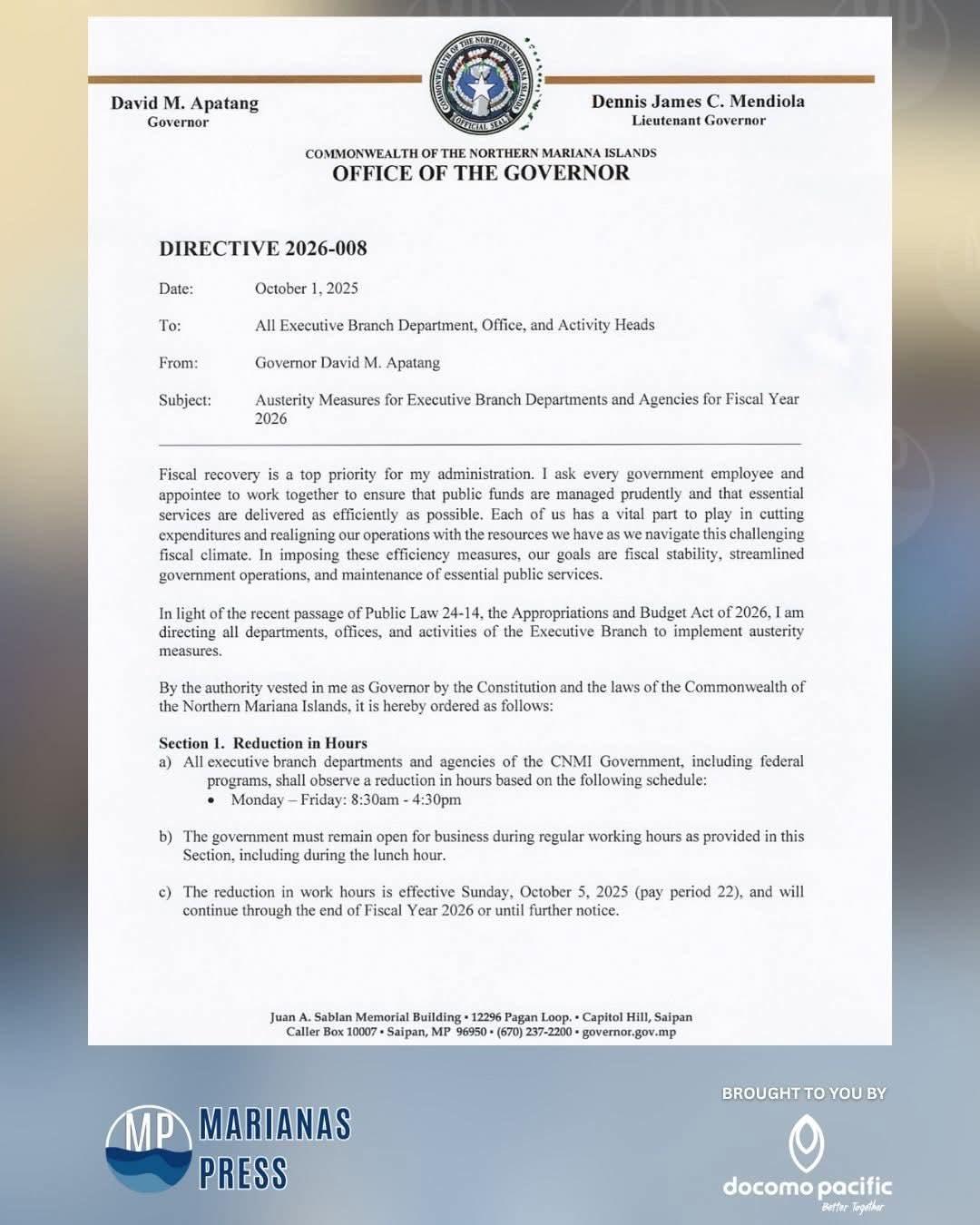 The following is a directive issued to executive branch department, office, and activity heads on October 01, 2025, by CNMI Gov. David Apatang. He outlines austerity measures for executive branch departments and agencies for fiscal year 2026