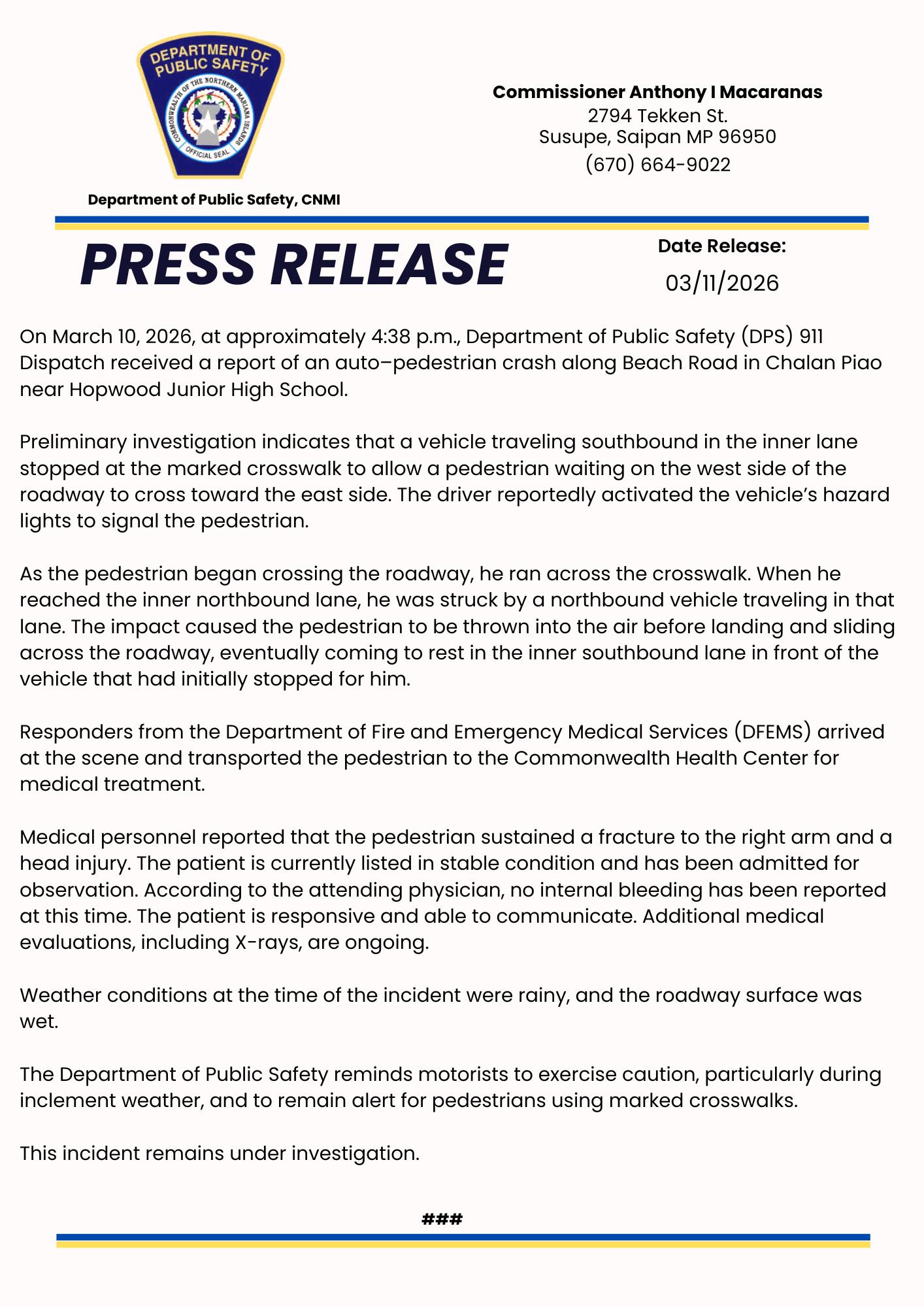 DPS statement on Auto-Pedestrian crash in Chalan Piao