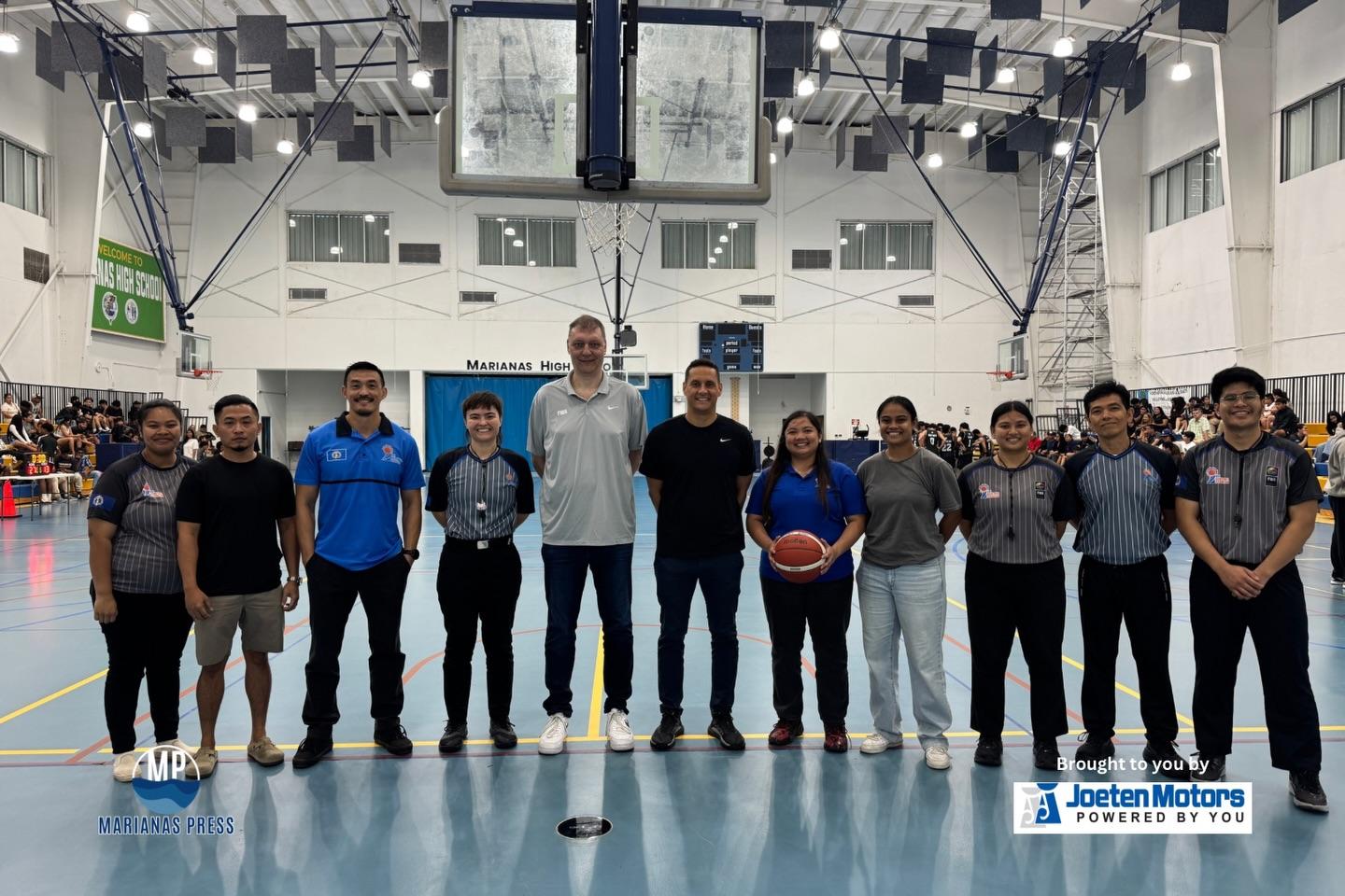 FIBA Europe’s Director/Head of National Federations & Sport Michal Konecny, fifth from left, and FIBA Oceania’s Partnership Manager, Siale Bain-Vete, sixth from left, are on a two-day visit in the CNMI for the first time. Here they are with members of the NMI Basketball Federation during one of the boys high school basketball game at Marianas High School earlier tonight.