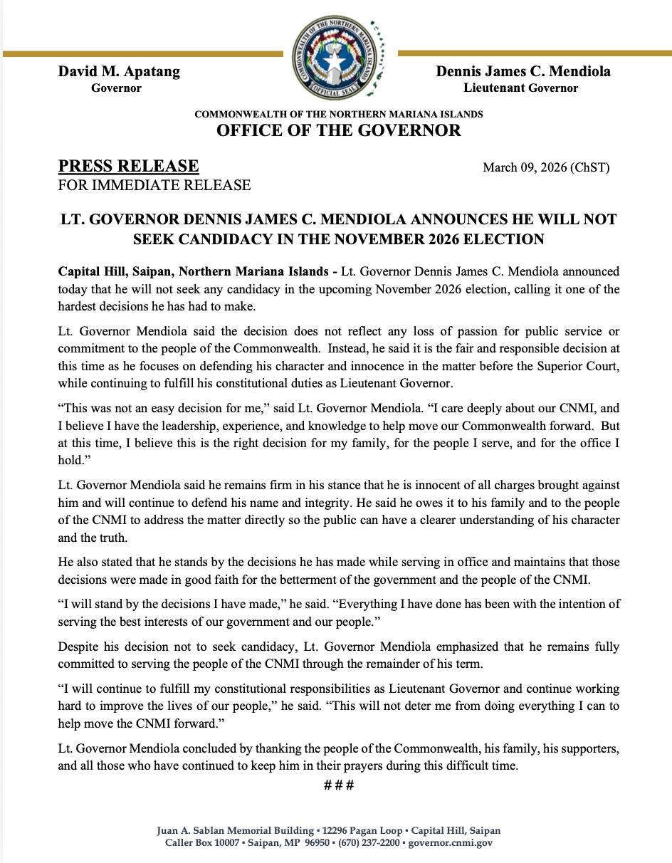 Lt. Governor Dennis James C. Mendiola Announces He Will Not Seek Candidacy in the November 2026 Election
