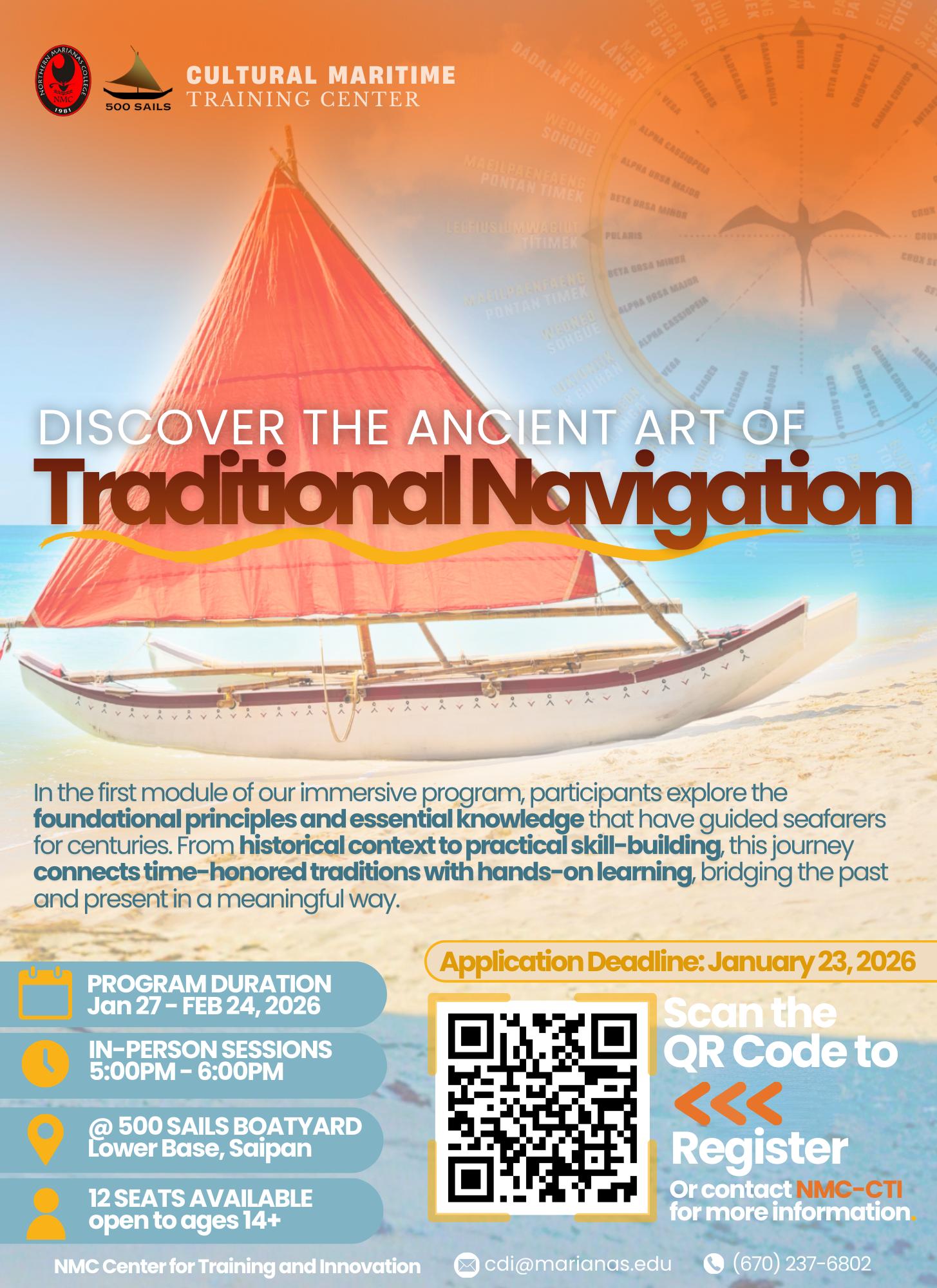 Northern Marianas College – Center for Training and Innovation (CTI), in partnership with 500 Sails, will offer the fifth cohort of its Cultural Maritime Training Center: Traditional Navigation – Module I program. This 8-week immersive course invites participants to discover the ancient art of traditional navigation and the cultural knowledge that has guided seafarers across the Pacific for generations.