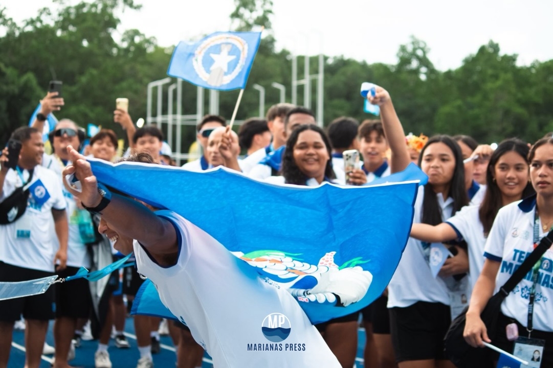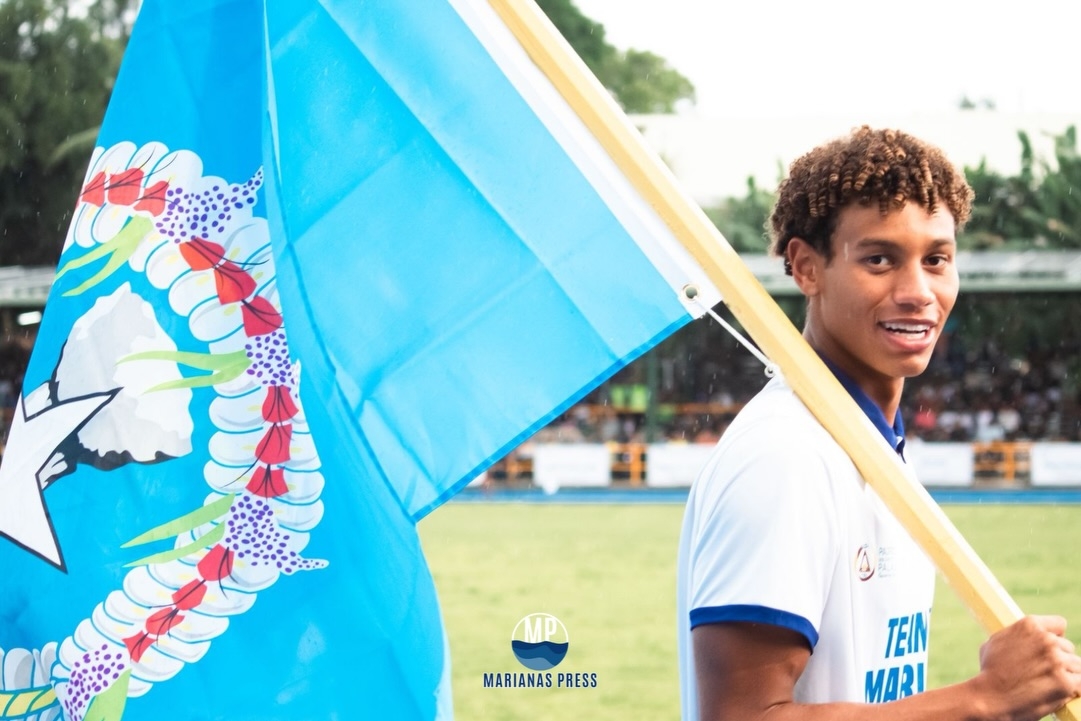 2025 Palau Pacific Mini Games flagbearer Isaiah Aleksenko carries the CNMI flag during the parade of teams