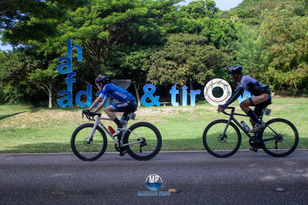 Leading bikers of the Hell of the Marianas pass the Hafa Adai & Tirow Sign in Marpi