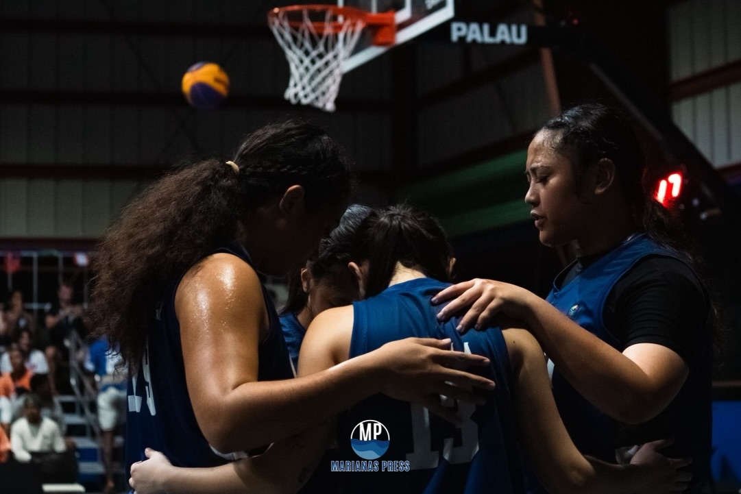 The 3x3 girls basketball team prays before their game in the Palau Pacific Mini Games