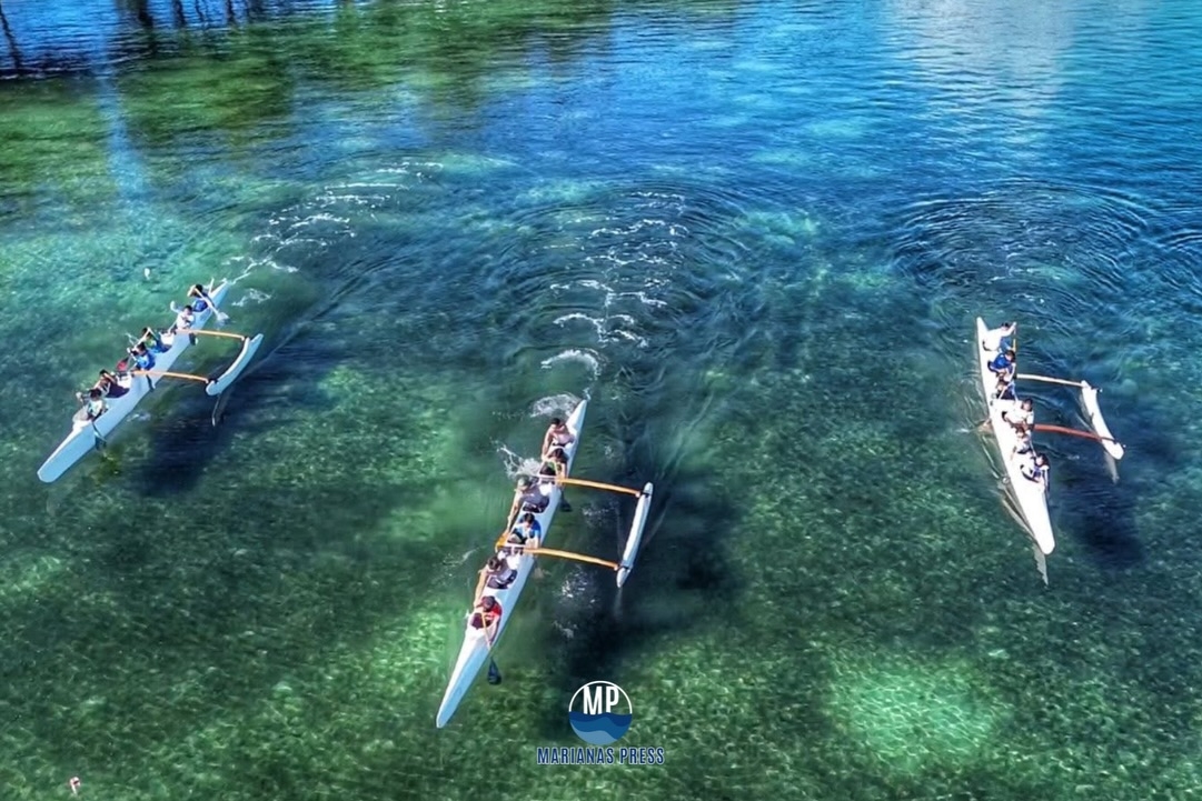 Three va’as are out in the water during practice before the Palau Pacific Mini Games